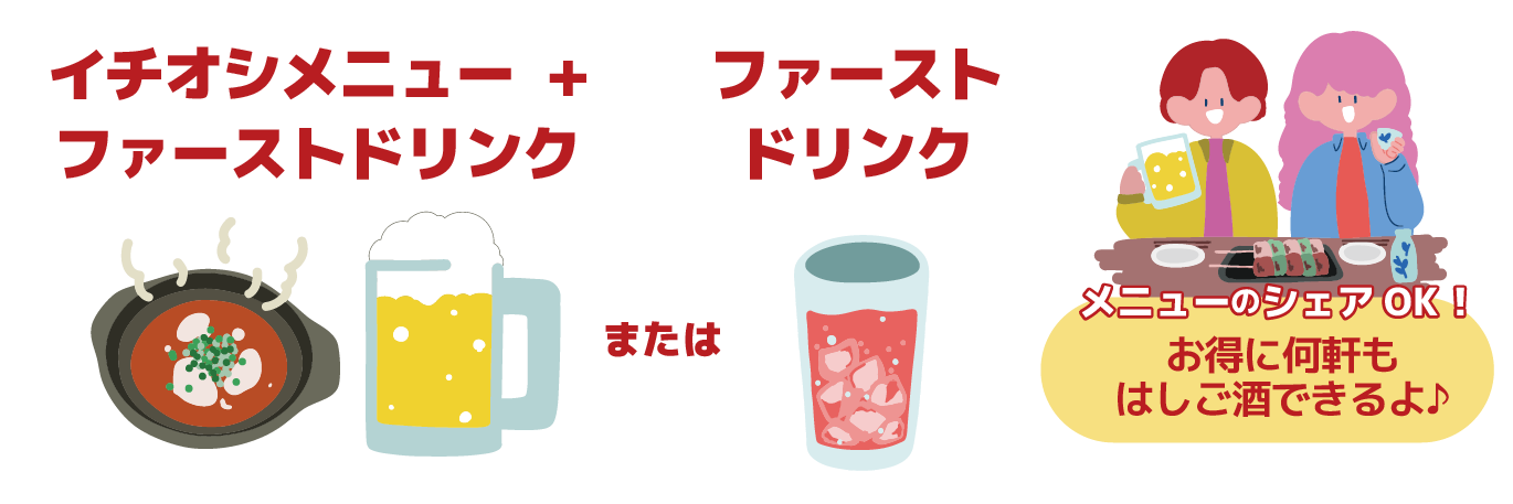 さらに、フードはこの期間だけの特別価格でご用意しています。限定セット(イチオシメニュー+ファーストドリンク)ははしご酒しやすい990円〜1,500円で提供。ファーストドリンク400円で注文もできます。イチオシメニューをシェアすれば一軒あたり1,000円以下という神コスパ!