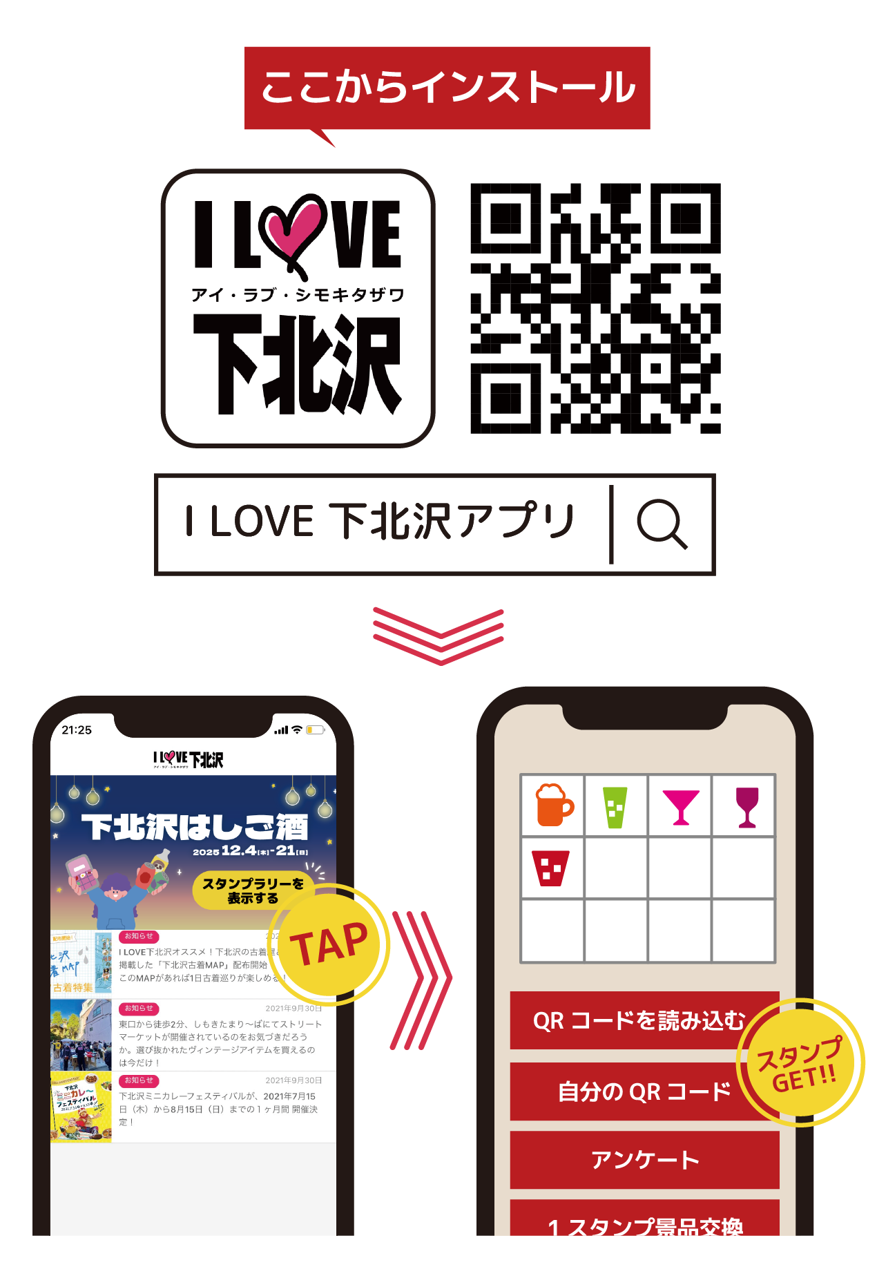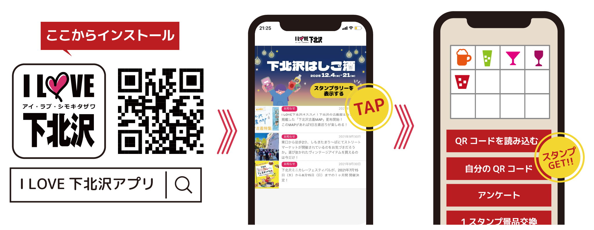 「I LOVE下北沢」のアプリでスタンプラリーに挑戦しよう!お店にあるQRコードをアプリで読み込むとスタンプを集められます。集めた数に応じて、お酒やドリンクなどの景品がもらえます。