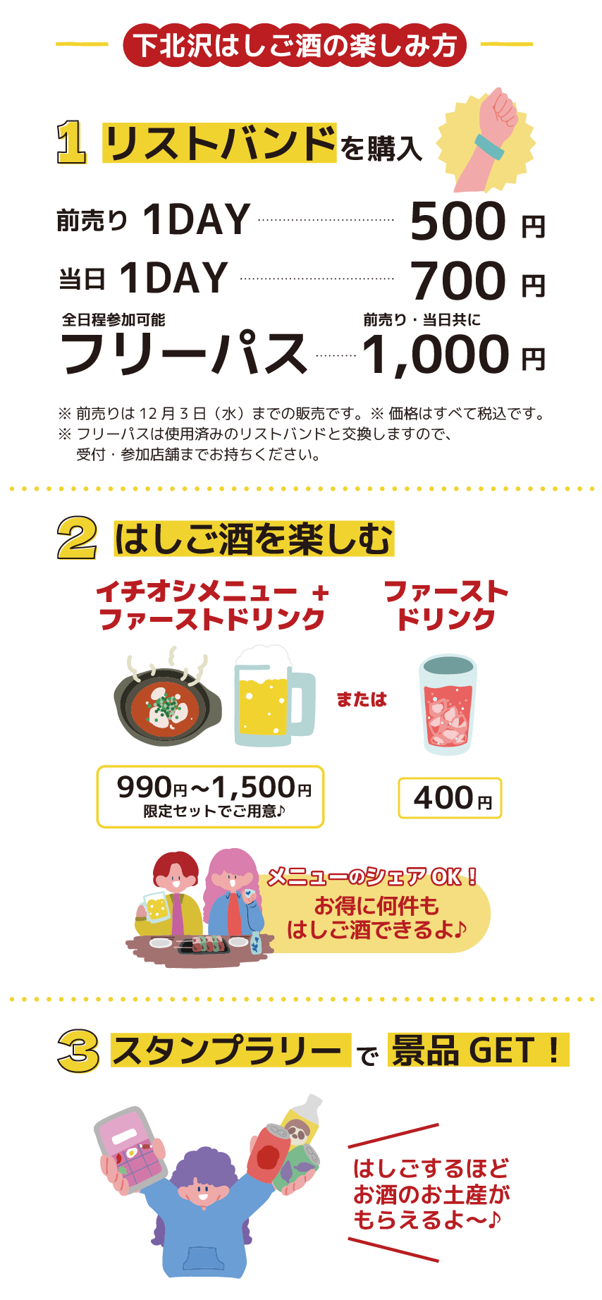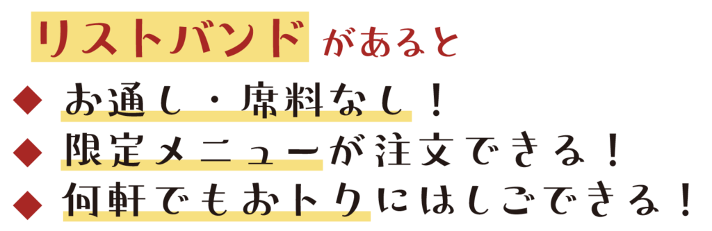 - リストバンドをお持ちの方は全店チャージ・お通しなしですが、持っていない方は必要なお店があります。