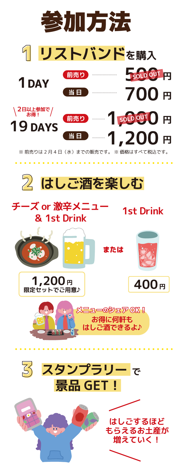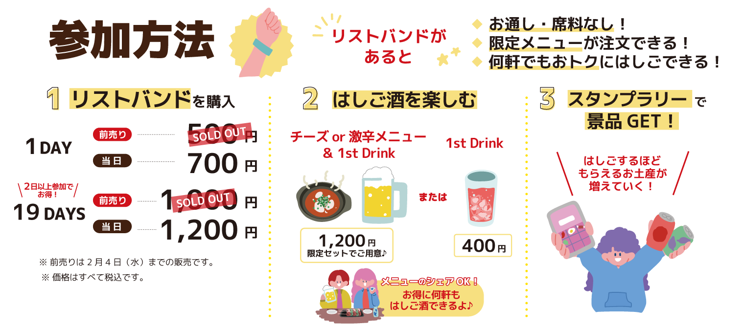 リストバンド(参加証)を提示すると、お通し・席料なし。何軒はしごしても「限定メニュー+ファーストドリンク1,200 円」または「ファーストドリンク400円」とおトクに注文することができます。2人で参加する場合、限定メニューをシェアすれば、1軒あたり1人800円で堪能できる神コスパ!