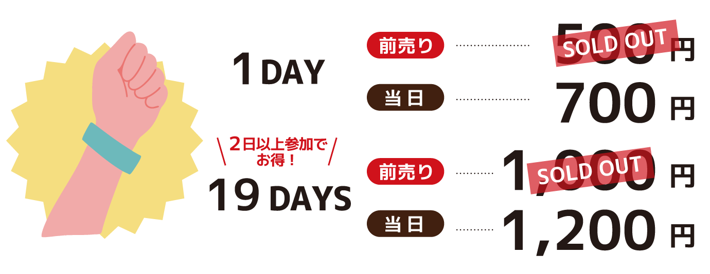 Teketよりご購入いただき、参加する日に受付でリストバンドをお渡ししますのでお立ち寄りください。