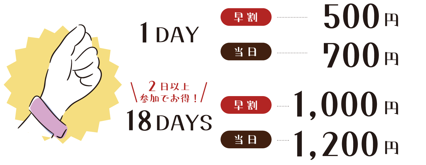 こちらよりご購入いただき、参加する日に受付でリストバンドをお渡ししますのでお立ち寄りください。