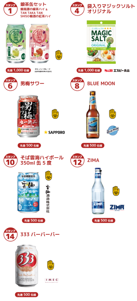 店舗に設置された QR コードを読み取ると「店舗スタンプ」、参加者同⼠で交流すると「飲み友スタンプ」を集めることができます。集めたスタンプ数に応じて、お酒などの景品をプレゼントいたします。スタンプが貯まるほどもらえる景品が増える、おトクなスタンプラリーです。ぜひご参加ください。