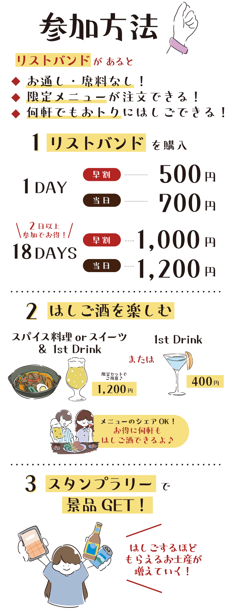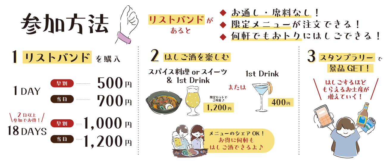 リストバンド(参加証)の提⽰で、お通し・席料はかかりません。何軒はしごしても「限定メニュー+ファーストドリンク 1,200 円(税込)」または「ファーストドリンク 400 円(税込)」とおトクに注⽂することができます。
